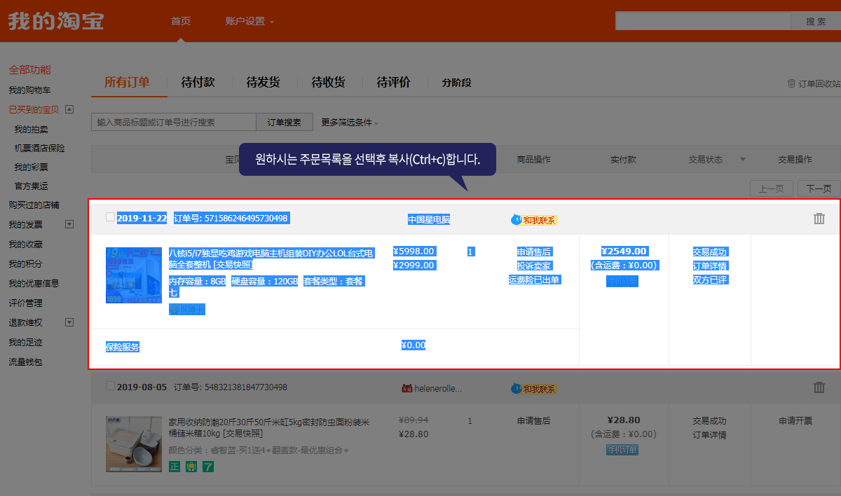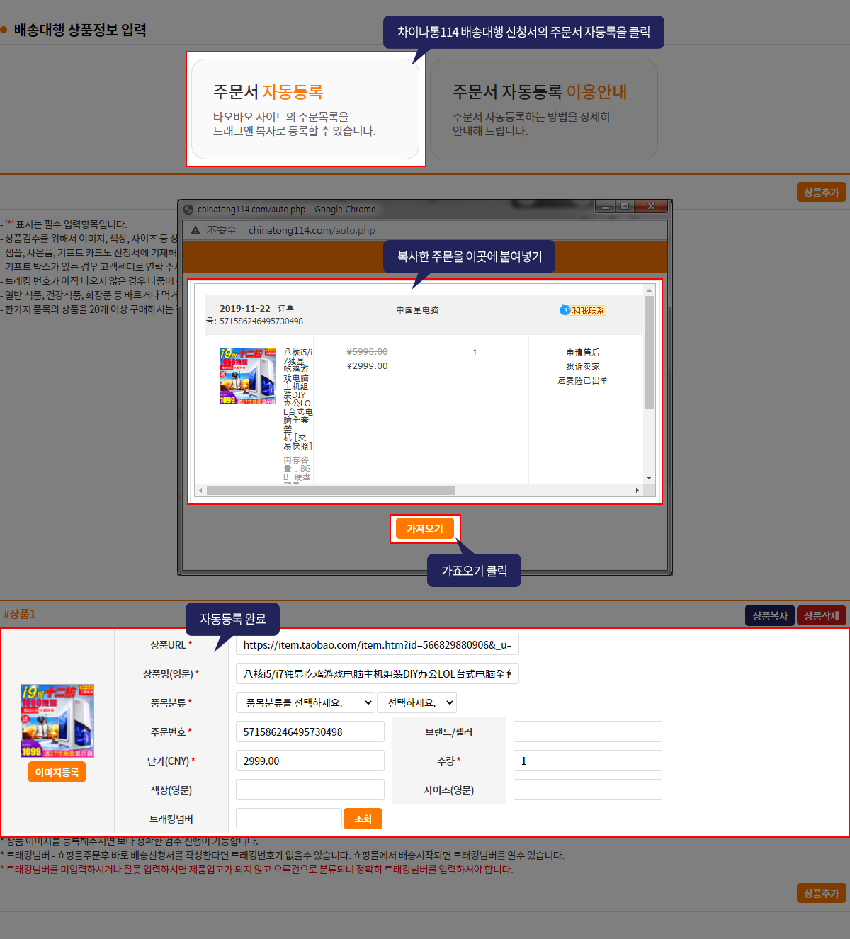 복사한 주문목록을 차이나통114 배송신청서에 자동등록
